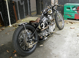 Super cool home-built race bike. Engine looks to be about a 1913. The fork looks stock but, the springer portion has been removed. Moving the wheel back like that must make for some pretty quick steering. The rear of the frame has been shortened and what looks like a bicycle seat added. Custom handle bars?